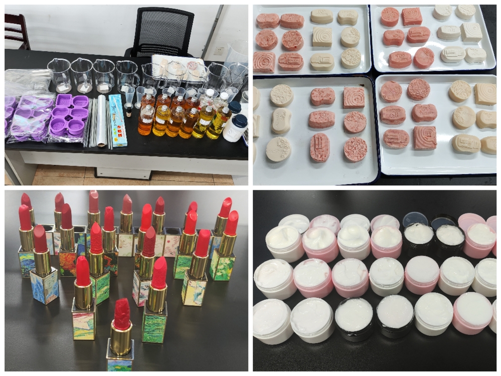微专业课程设置包括《皮肤科学》、《化妆品功效评价》等理论课程以及化妆品相关实践课程。理论学习从皮肤、毛发、口腔、香水类及特殊用途化妆品等的成分到化妆品生产原料与工艺、质量特征,可谓干货满满;实践课程设置了有趣的实验教学,例如制作口红、美肤精油皂和护手霜等。在实验老师的指导下,同学们亲自动手制作出各种精美实用的化妆品,切身体验化妆品的魅力。