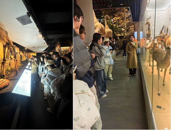 抵达博物馆后,在老师的引导下,同学们带着课程中的疑问与思考,依次走进恐龙馆、海洋馆、贝林馆与生态馆,开启一场“识生物、守多样、悟共生”的探索之旅。在恐龙馆内,逼真的恐龙骨架与复原场景,让同学们直观感受史前生态系统的演变,了解生物多样性与环境变迁的紧密关联。海洋馆与贝林馆则成为“守护生物多样性”的生动课堂。海洋馆中,丰富的海洋生物标本、沉浸式的海洋生态模拟场景,展现了海洋生态的瑰丽与脆弱,让大家认识到海洋保护对全球生态平衡的重要意义。贝林馆内,来自全球珍稀动物标本错落陈列,讲解员结合标本背后的故事,阐述生物多样性保护的全球共识,以及我国在生态保护领域的责任与担当。