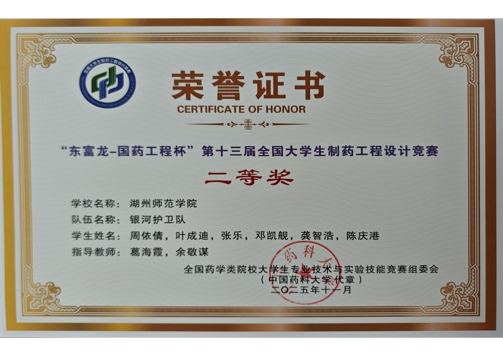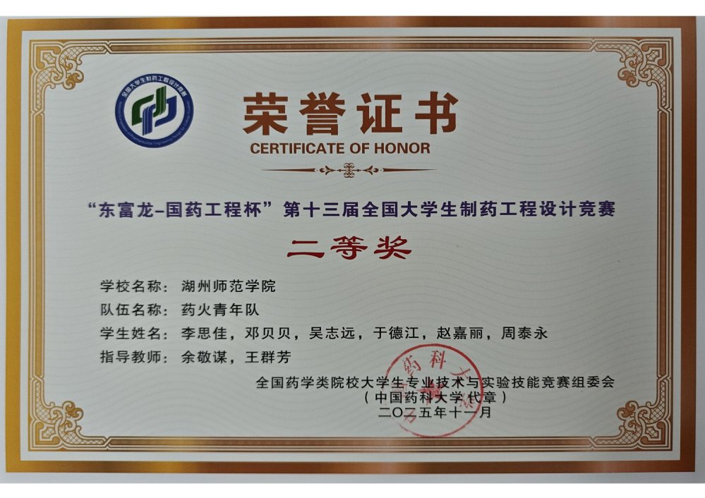 近日,“东富龙-国药工程杯”第十三届全国大学生制药工程设计竞赛圆满落幕。我院两支学生参赛队伍不负众望,双双斩获全国二等奖的佳绩。其中,由余敬谋、王群芳老师指导的“药火青年队”(成员:李思佳、邓贝贝、吴志远、于德江、赵嘉丽、周泰永),与葛海霞、余敬谋老师指导的“银河护卫队”(成员:周依倩、叶晨迪、张乐、邓凯舰、龚智浩、陈庆港)凭借扎实的专业功底和出色的设计方案脱颖而出。这是我院学子连续第四年在该赛事中斩获二等奖,充分彰显了我院制药工程专业的办学实力与人才培养质量。