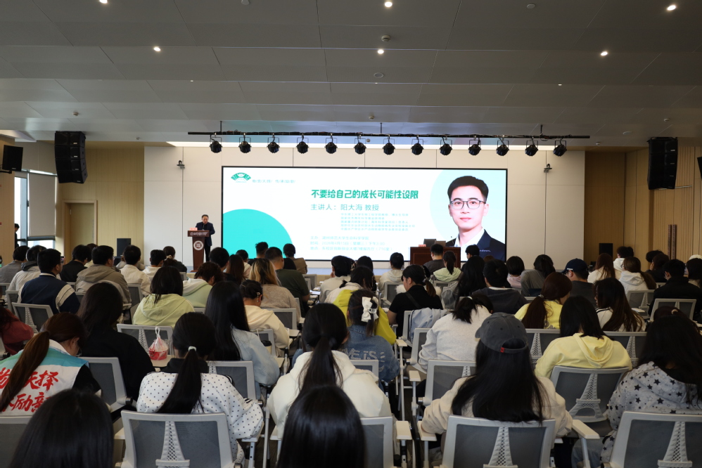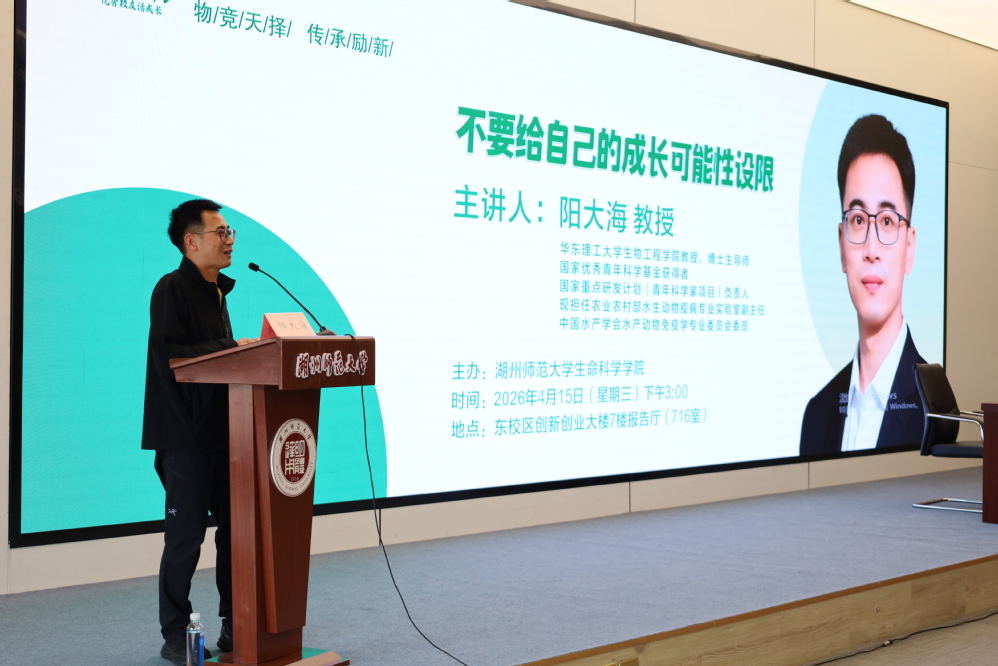 4月15日下午,湖州师范大学东校区创新创业大楼7楼报告厅内座无虚席、气氛热烈。生命科学学院举办“优秀校友话成长:不要给自己的成长可能性设限”主题讲座,特邀学院优秀校友、华东理工大学生物工程学院教授、博士生导师阳大海返校,为全院师生带来一场兼具思想深度、实践指导与情感温度的成长分享。本次讲座由学院院长王桦主持,260余名师生到场聆听、交流感悟。